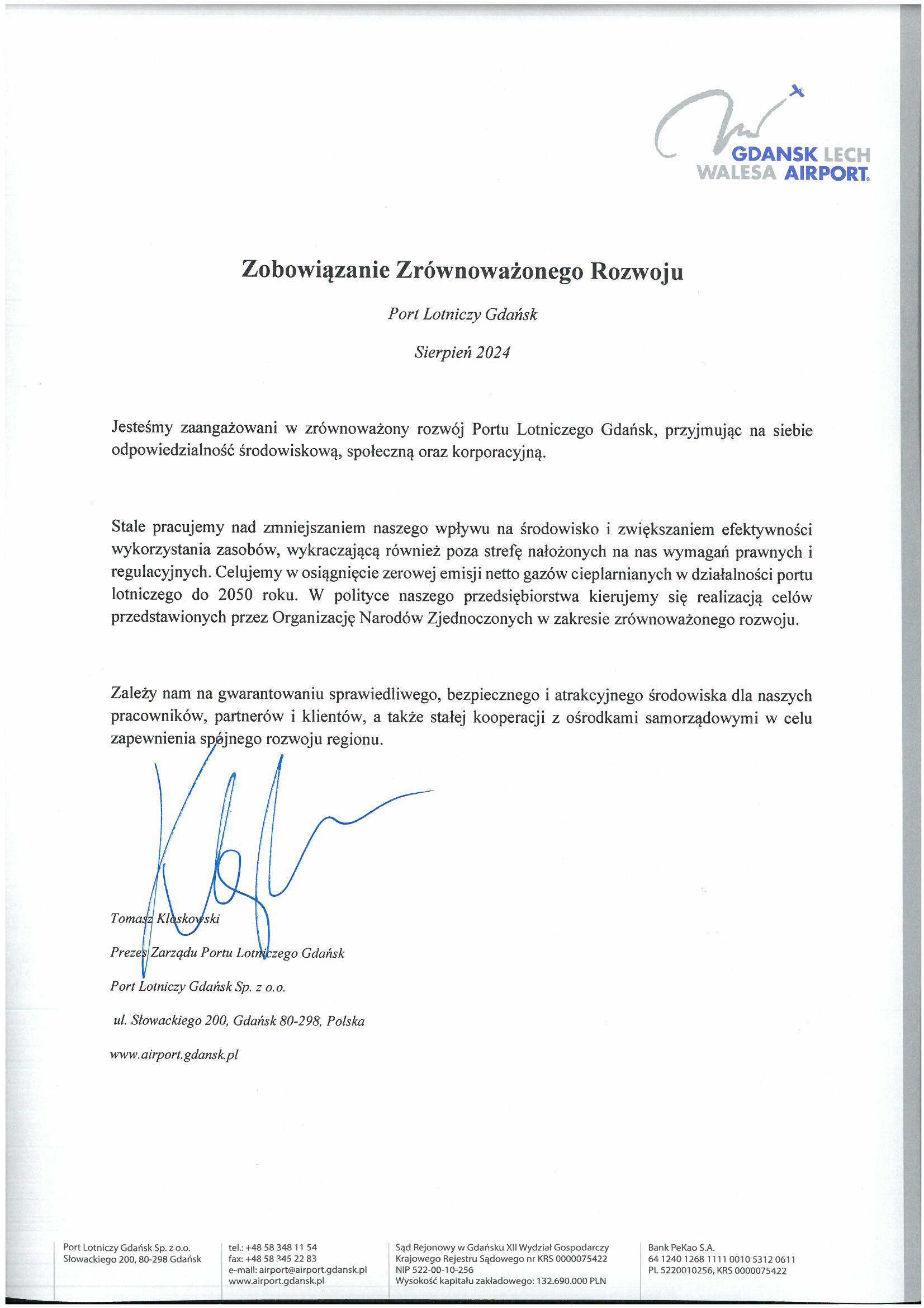 Zobowiązanie Zrównoważonego Rozwoju Portu Lotniczego Gdańsk im. Lecha Wałęsy.