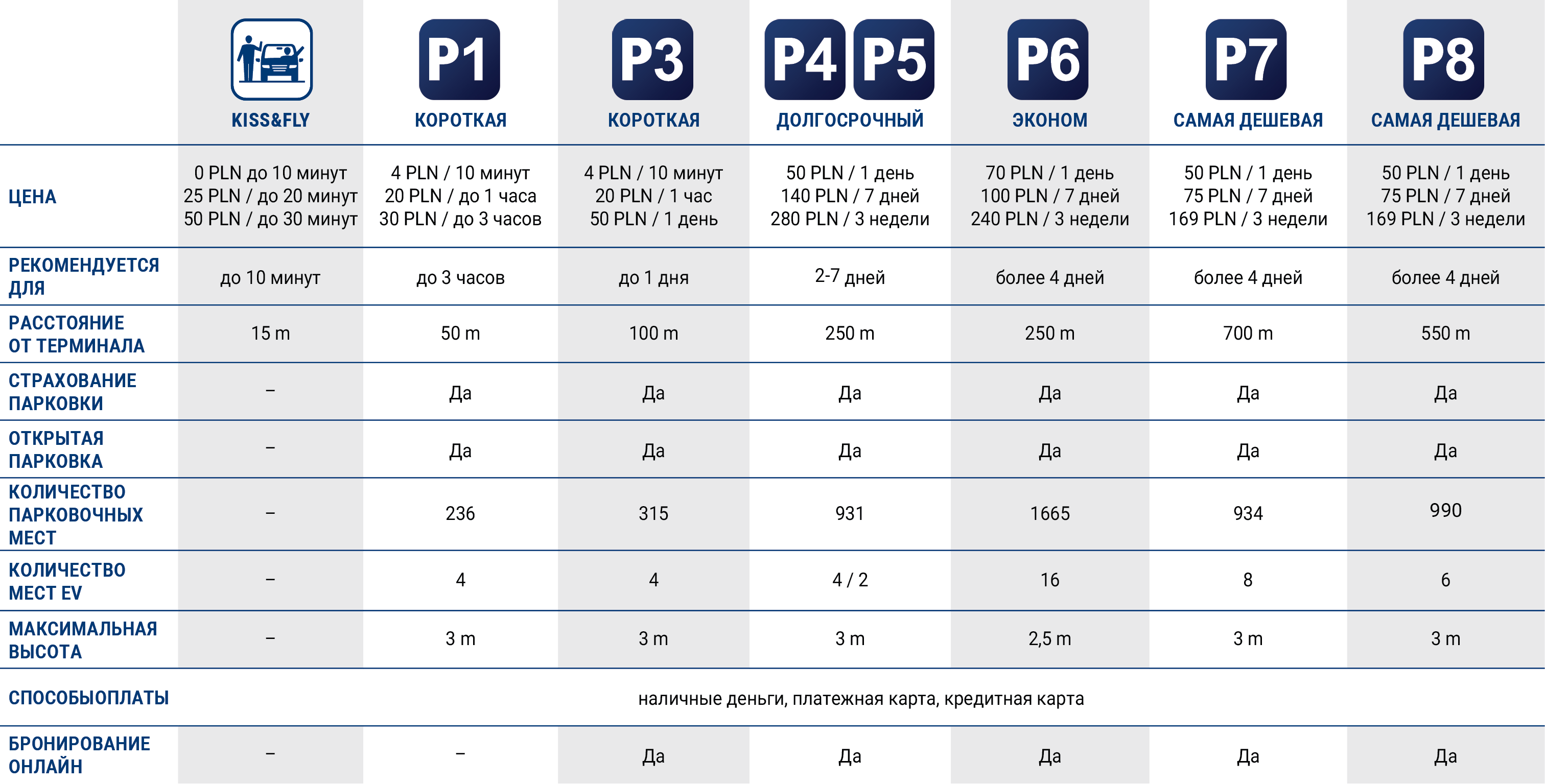 | Характеристика / Парковка | KISS&FLY | P1 КРАТКОСРОЧНАЯ | P3 КРАТКОСРОЧНАЯ | P4 / P5 ДОЛГОСРОЧНАЯ | P6 ЭКОНОМ | P7 САМАЯ ДЕШЕВАЯ | P8 САМАЯ ДЕШЕВАЯ |